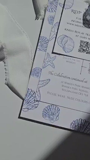 Every element has been thoughtfully designed to tell the beginning of your story together. Delicate, sketch-style illustrations of seashells and starfish in a classic ink-blue create a timeless backdrop for the details of your special day.
