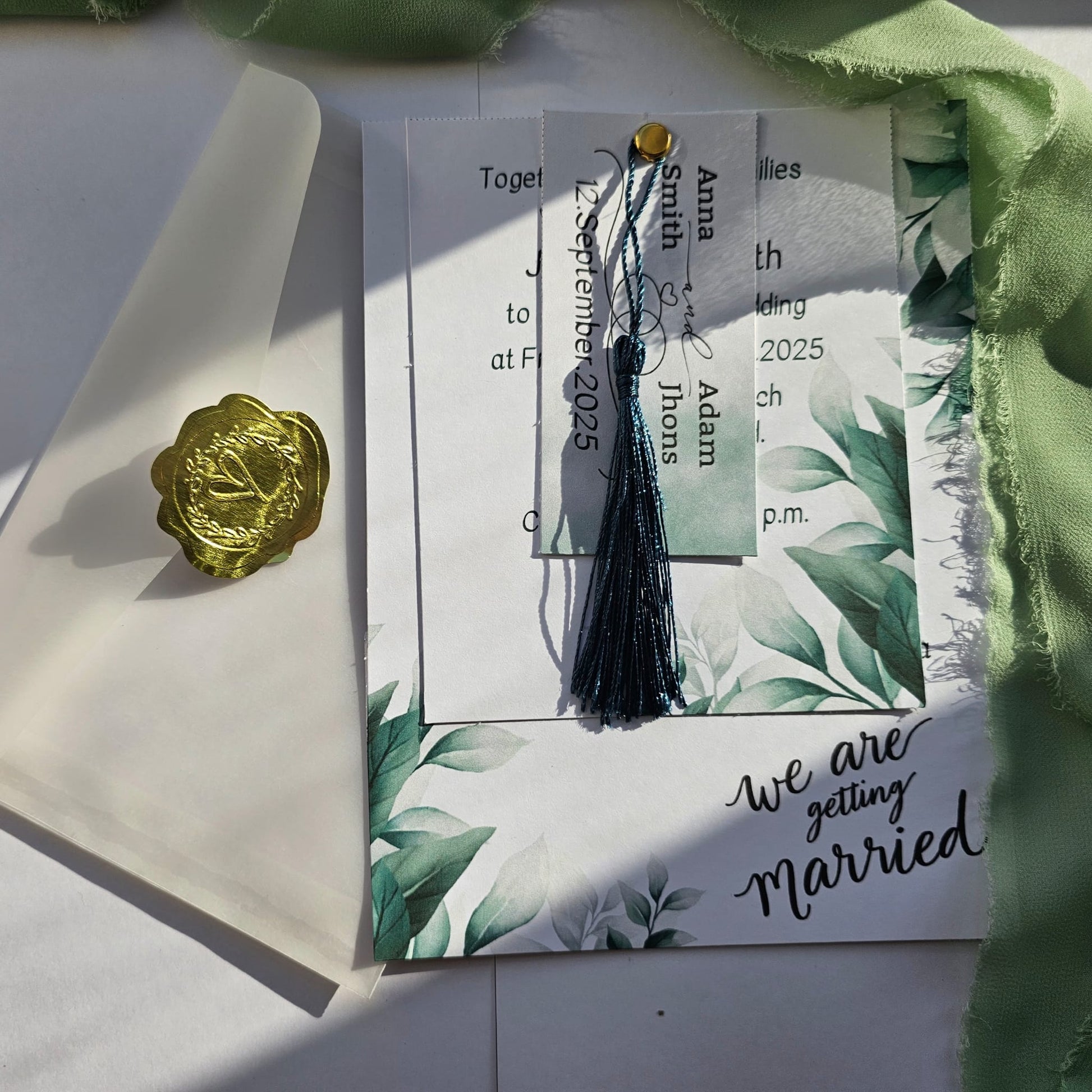 Unique Tassel Tag: In place of a traditional details card, the couple's names and wedding date are featured on a separate, stylish tag. It’s affixed with a gold stud and adorned with an elegant, deep teal tassel, creating a unique and eye-catching focal point.